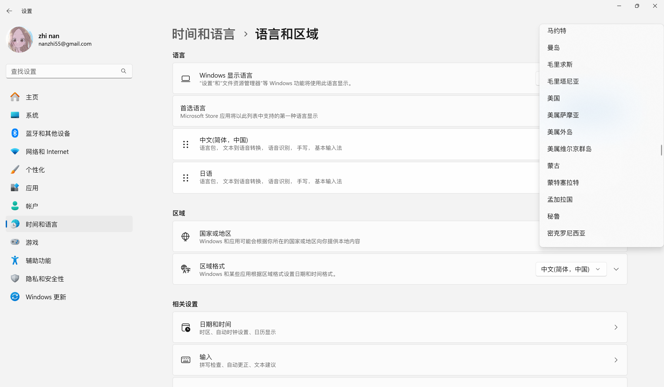 - 先来到Windows设置-时间和语言-语言和区域,将国家和地区改为