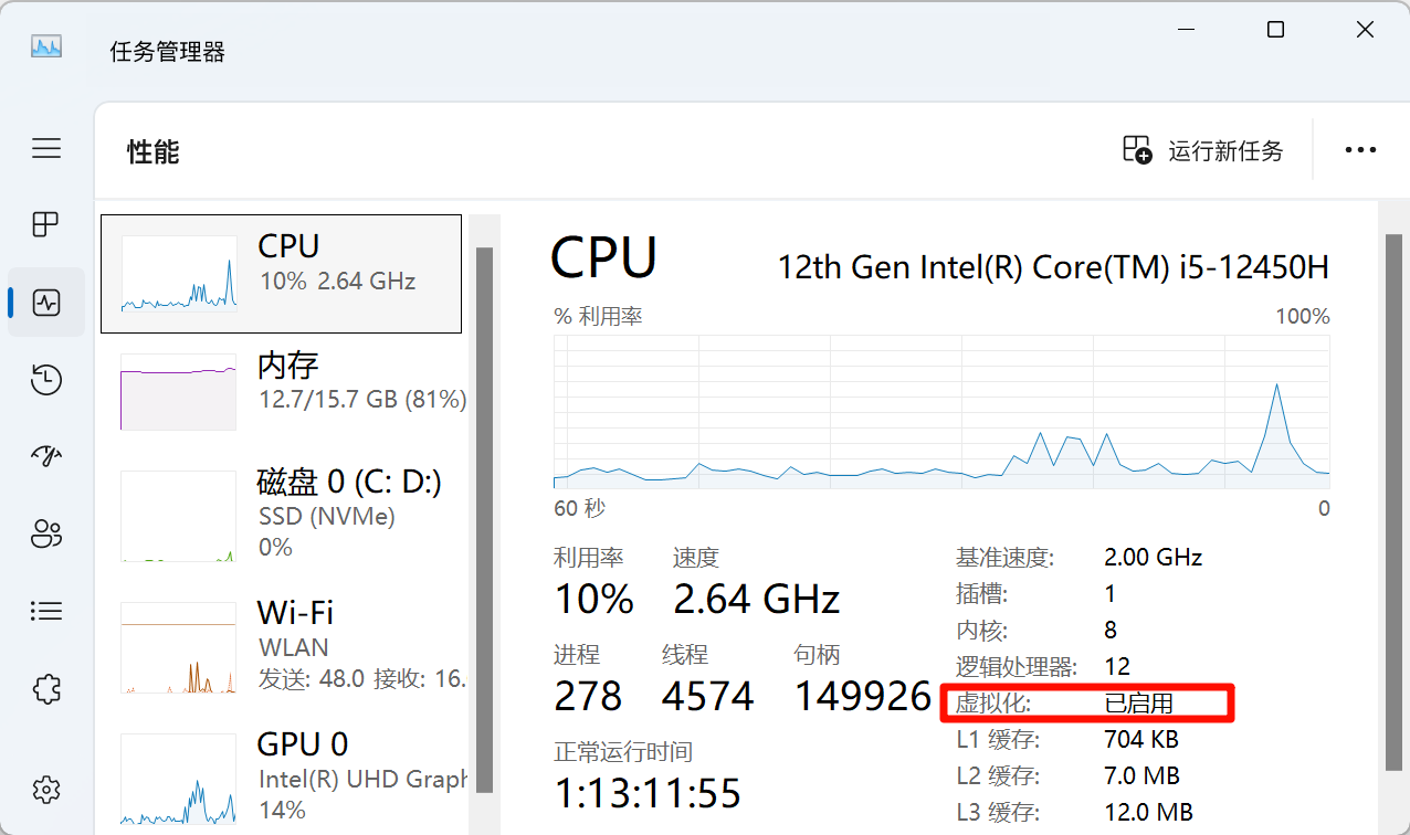 - 进入任务管理器在CPU页面查看是否开启了虚拟化