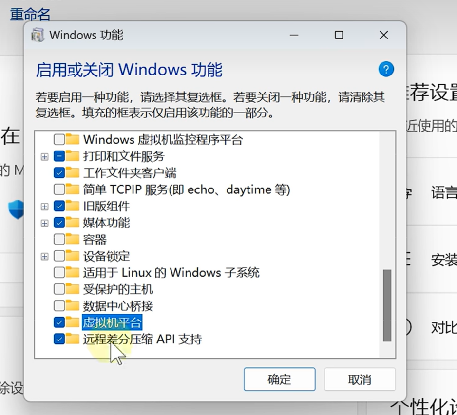 win徽标键,在搜索框里里搜索Windows功能,勾选虚拟机平台
