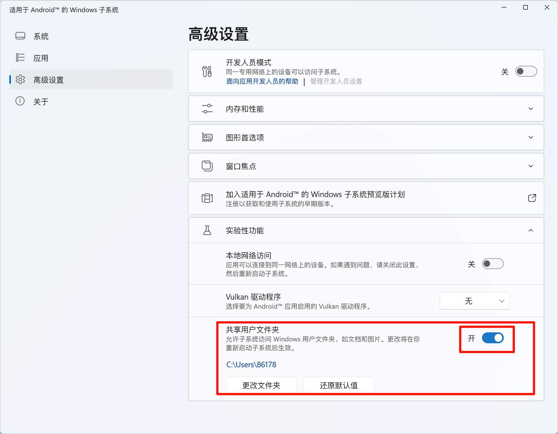 如图所示,打开安装系统的的高级设置-实验性功能-共享用户文件夹,然后可以更改成你存有软件apk的文件夹,这样你可以访问电脑上的apk文件来安装软件,然后打开系统-文件,选择apk安装软件